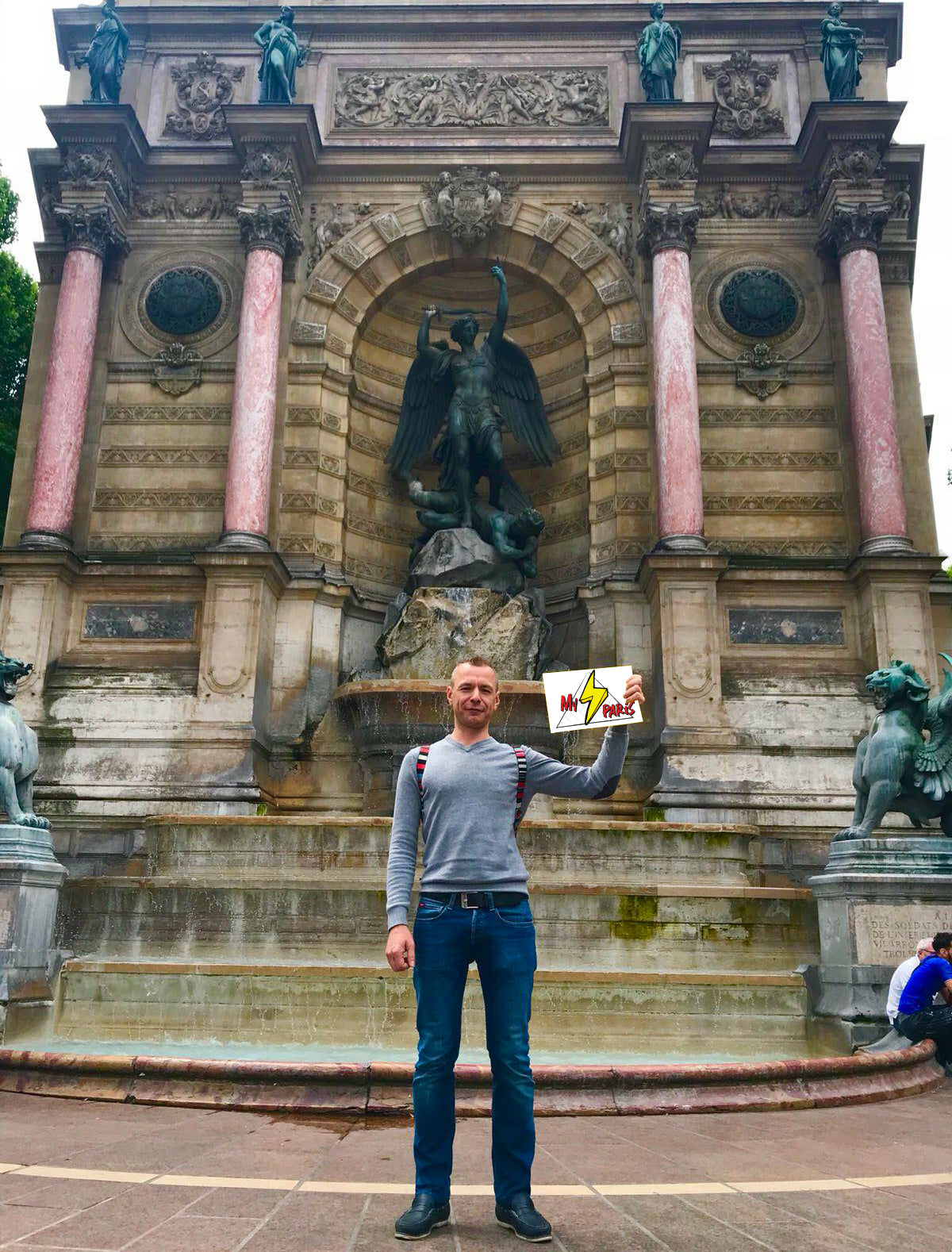 Гид с табличкой у фонтана Сен-Мишель